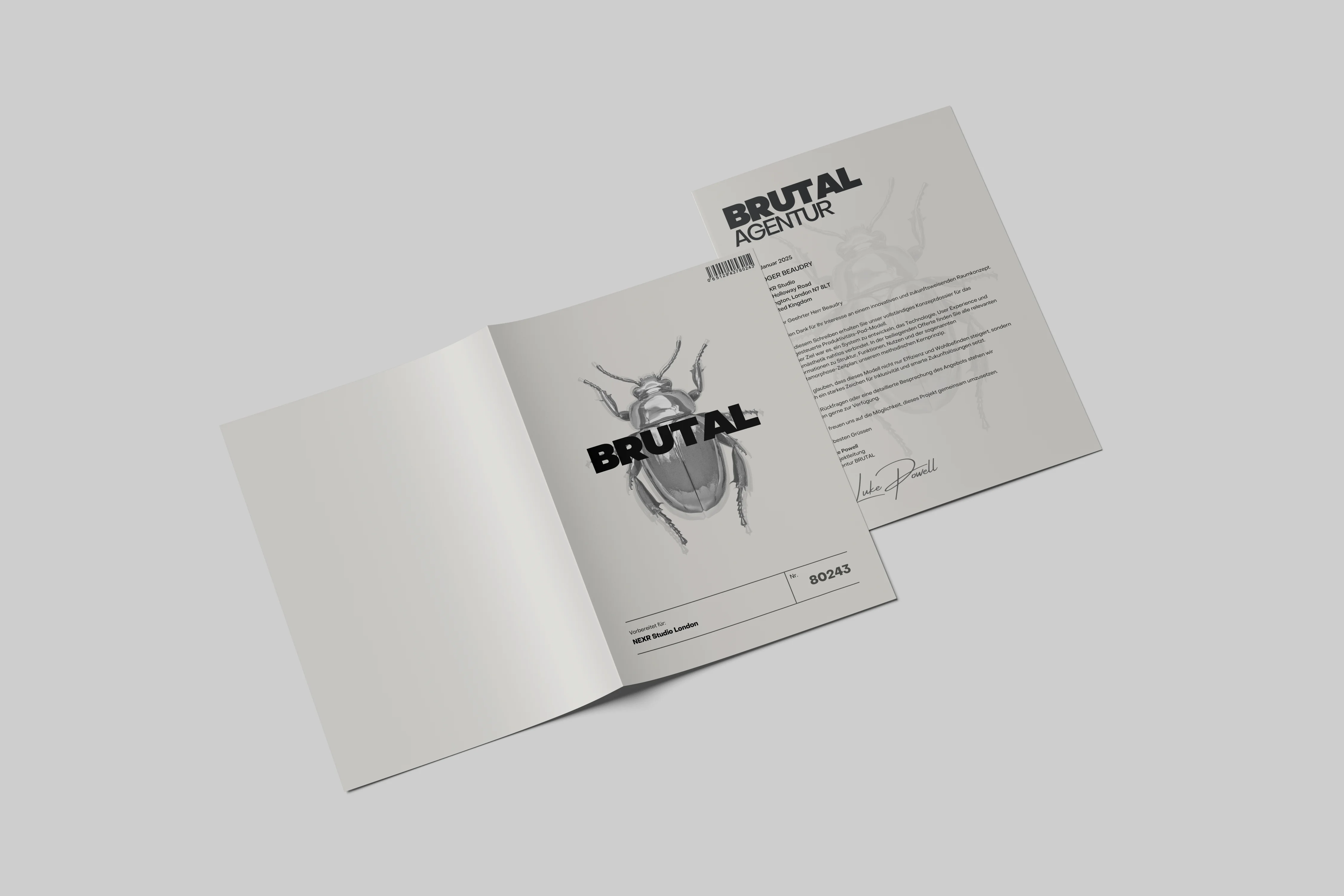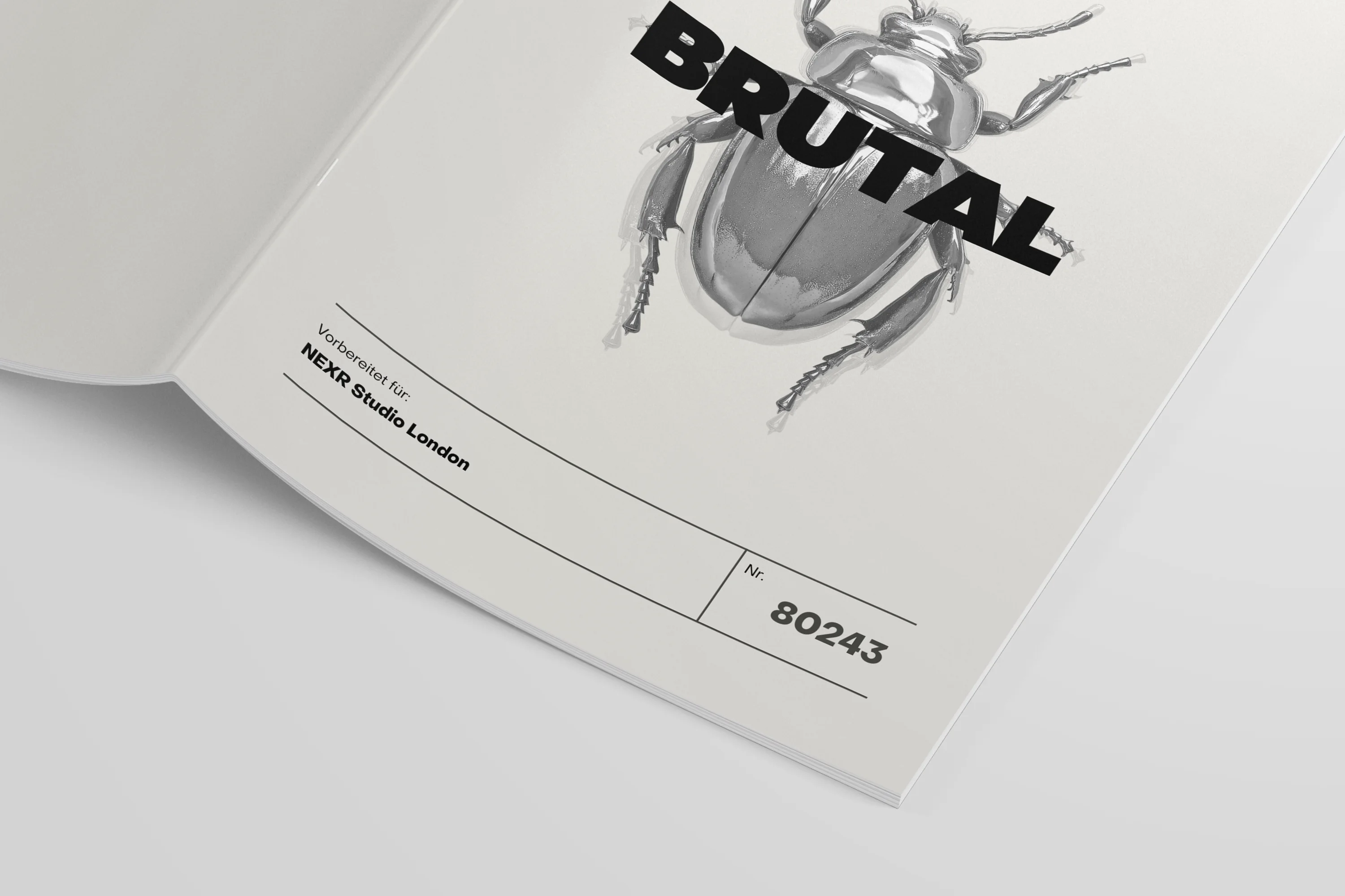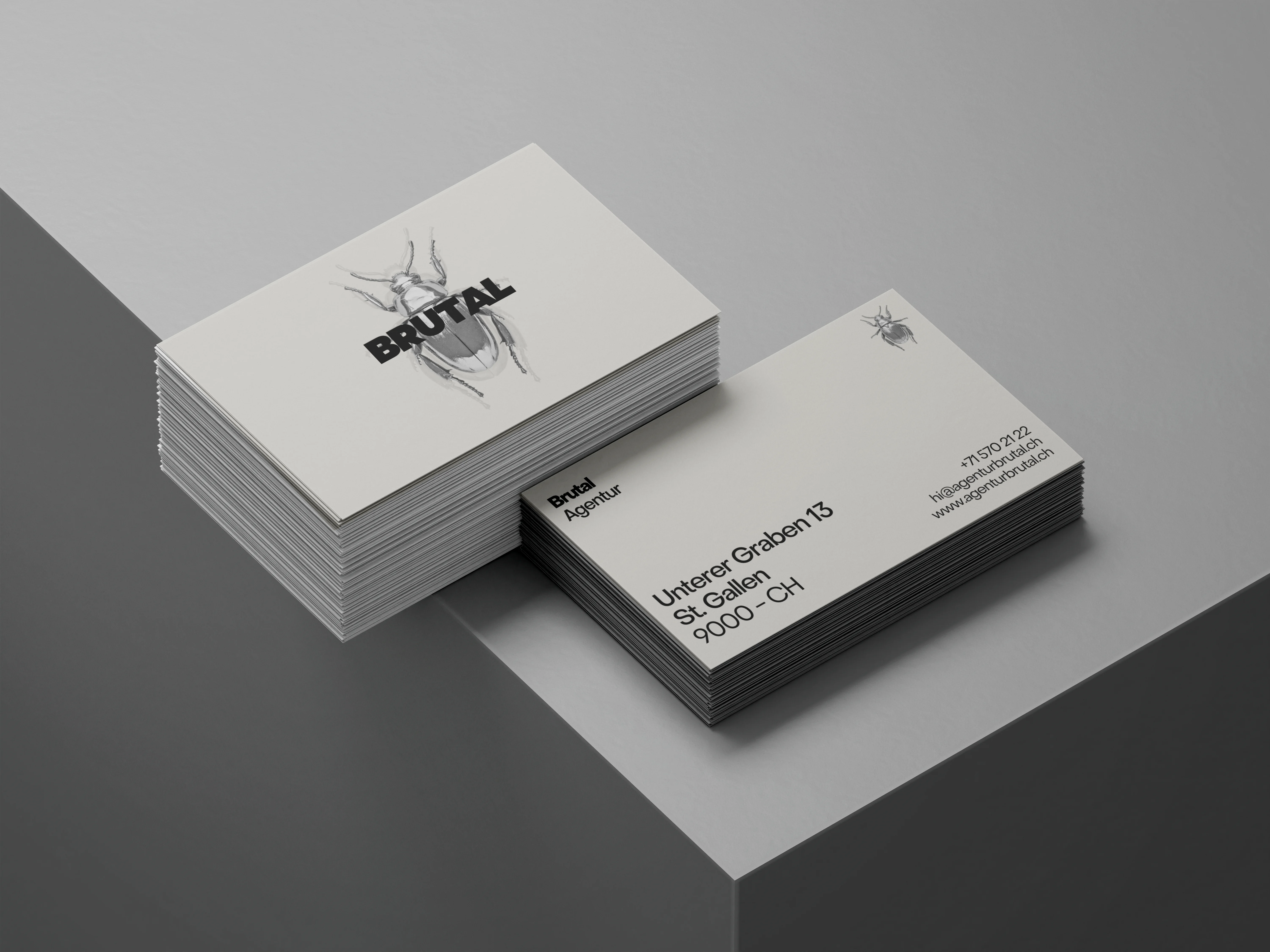 Agentur Brutal is a self-initiated studio branding project built around transformation as a design principle. A metallic beetle serves as the central symbol, representing metamorphosis, strength, and progression. The visual system translates process into form, applied consistently across print-based touchpoints such as stationery, business cards, folders, and social media assets.