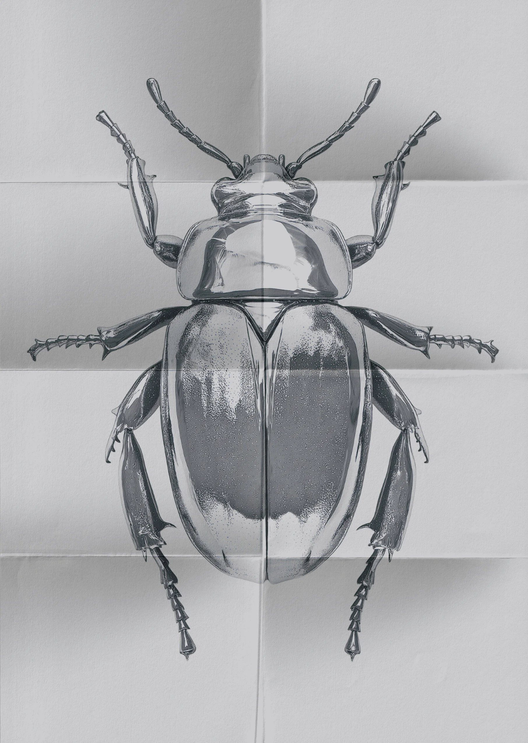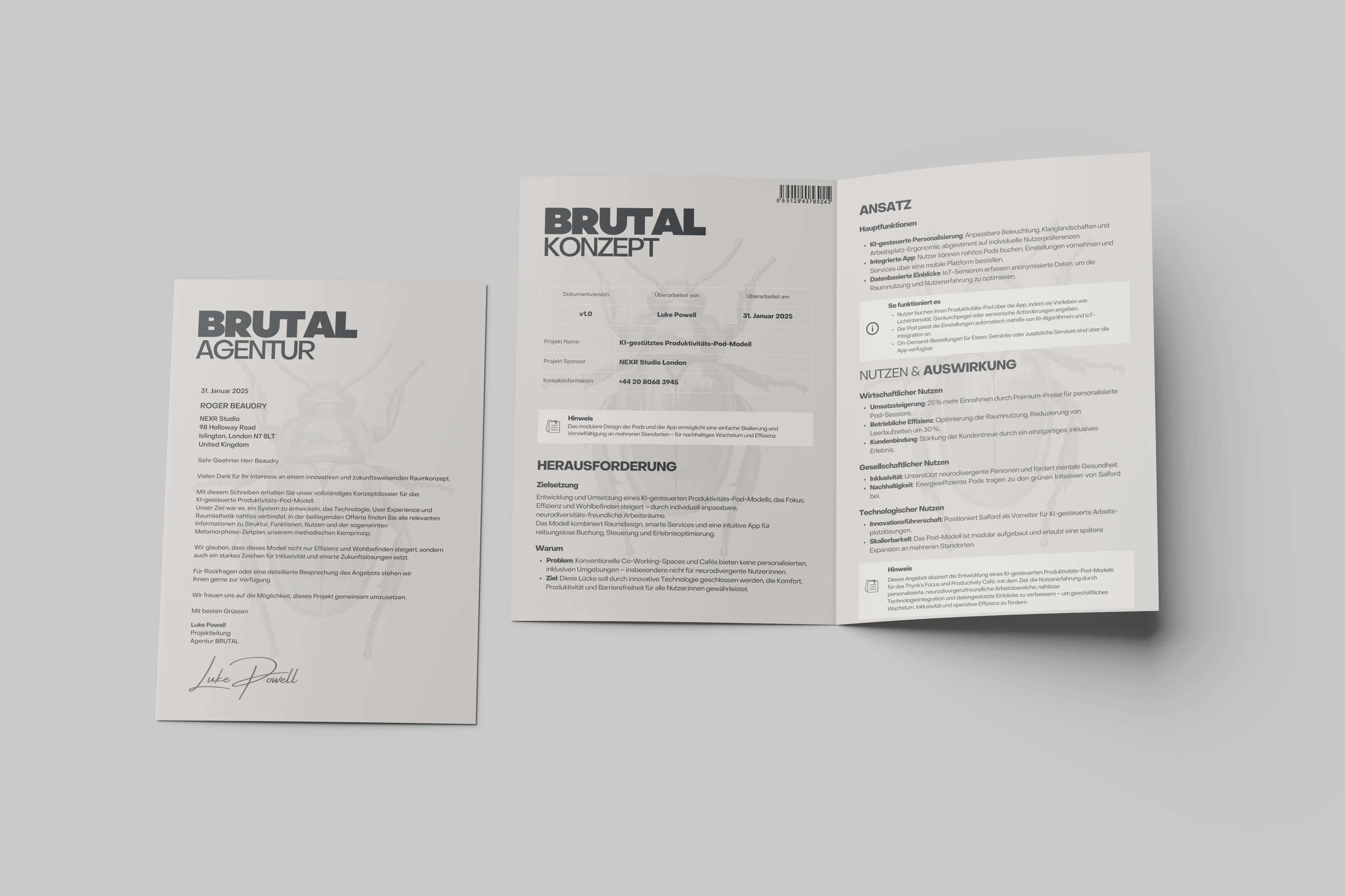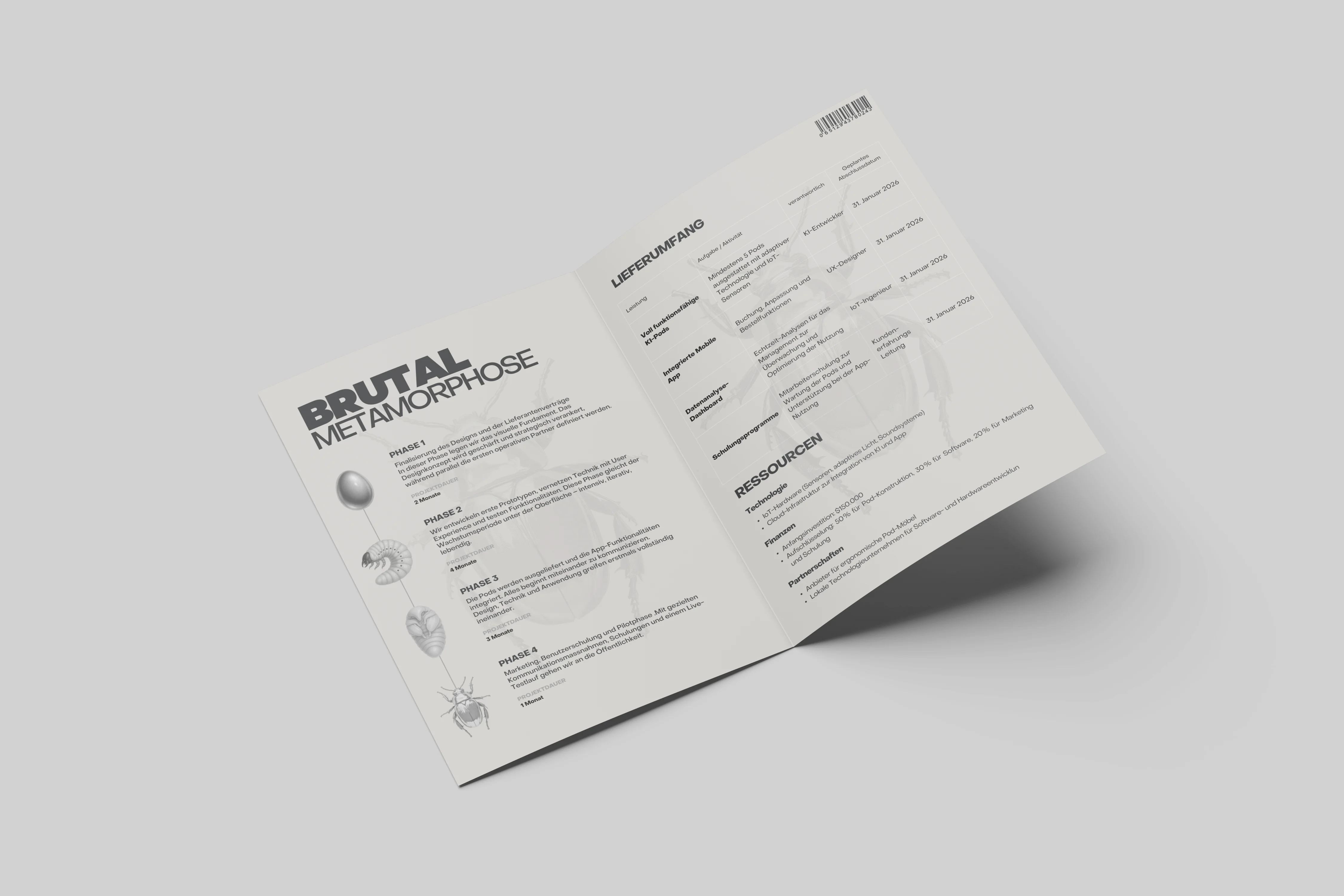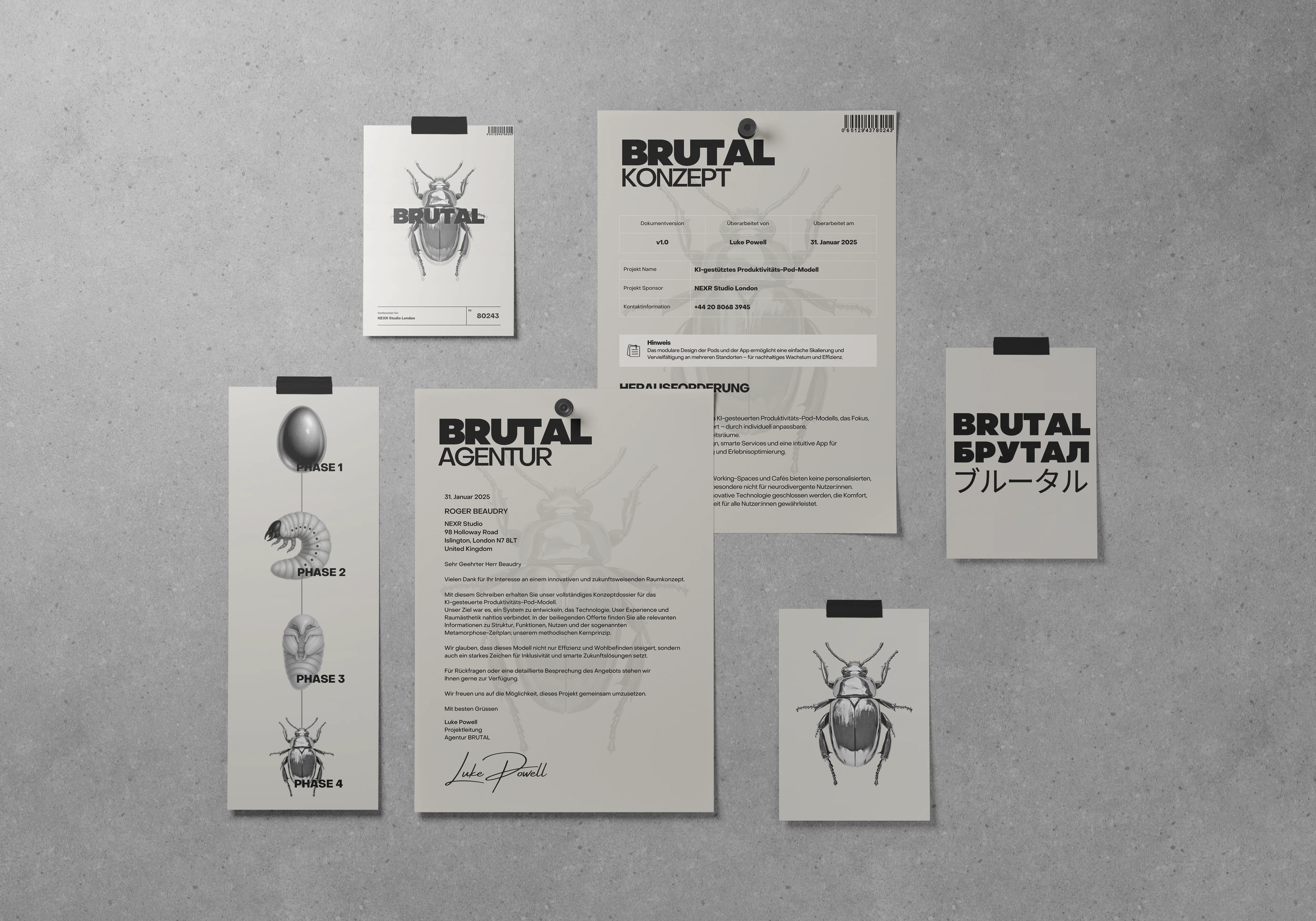 Agentur Brutal is a self-initiated studio branding project built around transformation as a design principle. A metallic beetle serves as the central symbol, representing metamorphosis, strength, and progression. The visual system translates process into form, applied consistently across print-based touchpoints such as stationery, business cards, folders, and social media assets.